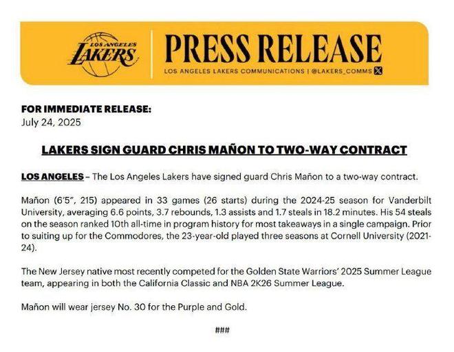 馬農今夏參加NBA選秀成為落選秀,隨后代表勇士出戰(zhàn)NBA夏季聯(lián)賽,場均貢獻9分4.3籃板1.9助攻1.6搶斷1.4蓋帽,如今以一份雙向合同簽約湖人。